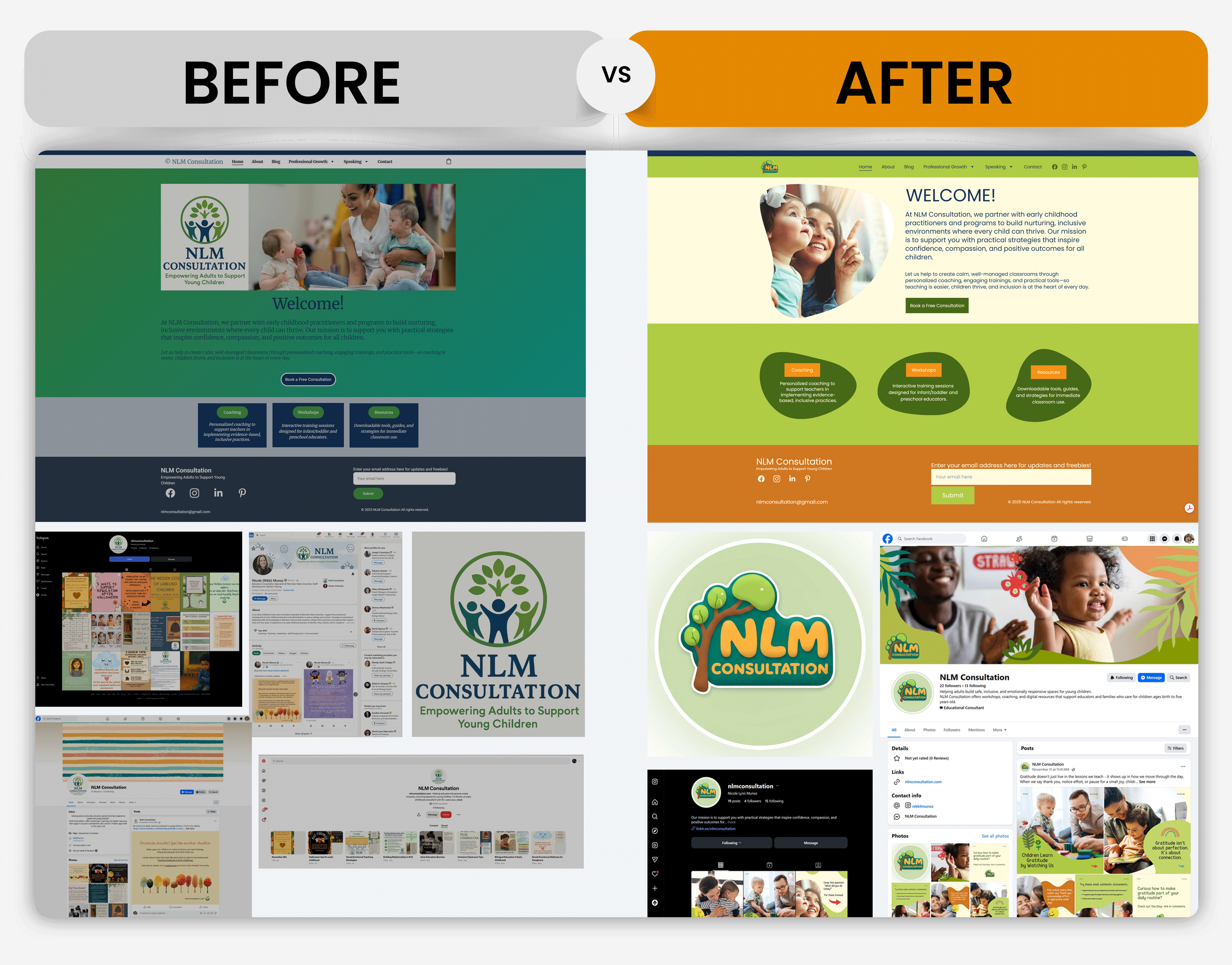 Overview: NLM Consultation supports early-childhood practitioners with practical tools, coaching, and community resources. When I came on board, the brand had great heart- but the visuals and strategy weren’t fully reflecting the quality of the work.